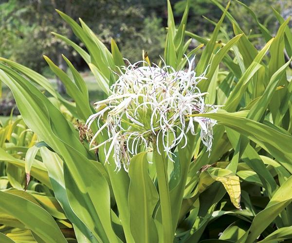 ดอก: คล้ายพลับพลึงดอกแดง แต่มีกลีบดอกเรียวแหลม สีขาว มีกาบรองช่อดอกเป็นเยื่อบาง ๆ สีเหลือง บานจากดอกวงนอกเข้าหาดอกวงใน ช่วงใกล้ค่ำถึงเช้ามีกลิ่นหอม ออกดอกตลอดปี ดอกดกในช่วงฤดูฝน