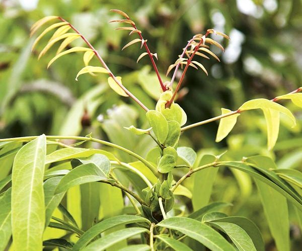 ใบ: ใบรูปไข่ ขนาด 14 – 18 เซนติเมตร ขอบใบจักมนและแหลม หูใบเปิด ใบด้านบนสีเขียว ใต้ใบสีแดงอมม่วงเรื่อ มีจุดสีม่วงเข้มกระจายทั่วใต้ใบ