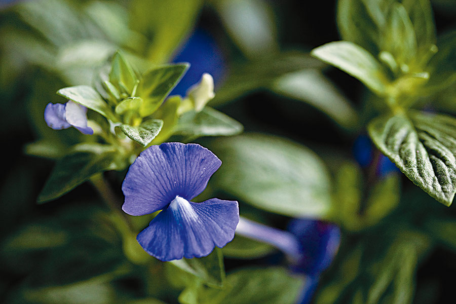 ดอก : ดอกเดี่ยว ออกเป็นกระจุกตามปลายยอด เส้นผ่านศูนย์กลางดอก 2.5 เซนติเมตร ดอกสีม่วงอมน้ำเงิน กลางดอกสีขาว โคนกลีบเชื่อมติดกันเป็นหลอดแคบ ปลายแยกเป็นกลีบค่อนข้างกลม 2 กลีบ ออกดอกตลอดปี