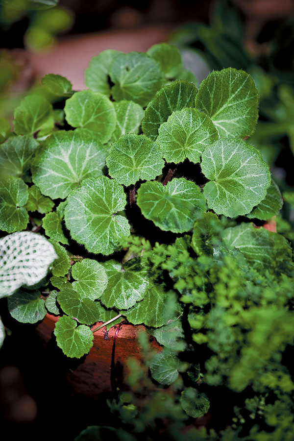 ใบ: ใบเดี่ยว ออกเป็นกระจุกแน่นแผ่คลุมดิน รูปกลมถึงรูปไต เส้นผ่านศูนย์กลาง 3 – 7เซนติเมตร ขอบใบหยักมน พื้นใบสีเขียว มีด่างสีขาวตามเส้นใบ ใต้ใบสีแดงเรื่อ