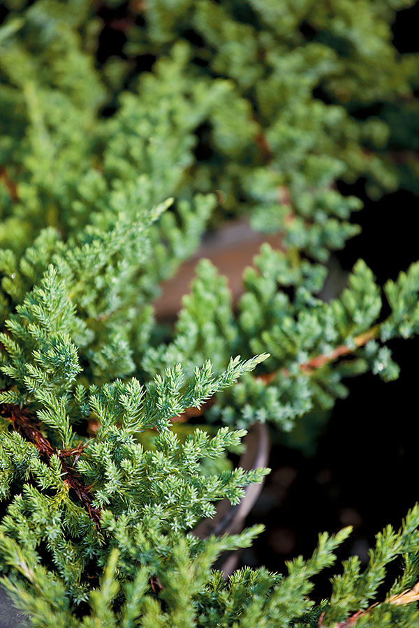 ใบ: รูปเข็ม ปลายใบเรียวแหลม สีเขียวอ่อน แผ่นใบโค้งนูน ใต้ใบเว้า มีแถบปากใบสีเขียวเทา2 แถบ อาจมีแบบใบเกล็ดด้วย มีหลายพันธุ์ เช่น พันธุ์แคระ (J. procumbens‘Nana’) มีกิ่งย่อยสั้น ใบออกเป็นกระจุกสั้นและแน่น สีเขียวเทา