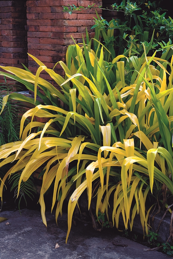 การใช้งานและอื่นๆ : เนื่องจากมีใบสีเหลืองเด่นสะดุดตา จึงนิยมปลูกประดับสวน หรือปลูกคลุมดิน ริมน้ำตก ลำธาร ริมถนน ทางเดิน หรือริมทะเล ควรปลูกใกล้กับพลับพลึงตีนเป็ด ไม่เหมาะกับสวนหย่อมเพราะกอต้นมีขนาดใหญ่
