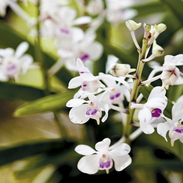 ดอก: ดอกออกเป็นช่อที่ด้านข้าง จำนวน 10 – 15 ดอก สีขาว บานเต็มที่กว้าง 1.5 เซนติเมตร กลีบปากอาจมีสีม่วงอ่อน ออกดอกเดือนมีนาคม – พฤษภาคม