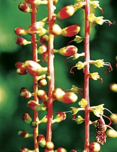 ดอก: ช่อดอกออกเป็นช่อกระจะที่ปลายยอด ห้อยลง ดอกเล็ก กลีบดอกสีขาวเกสรสีแดงมักร่วงง่ายพร้อมกลีบดอก มีจำนวนมาก
