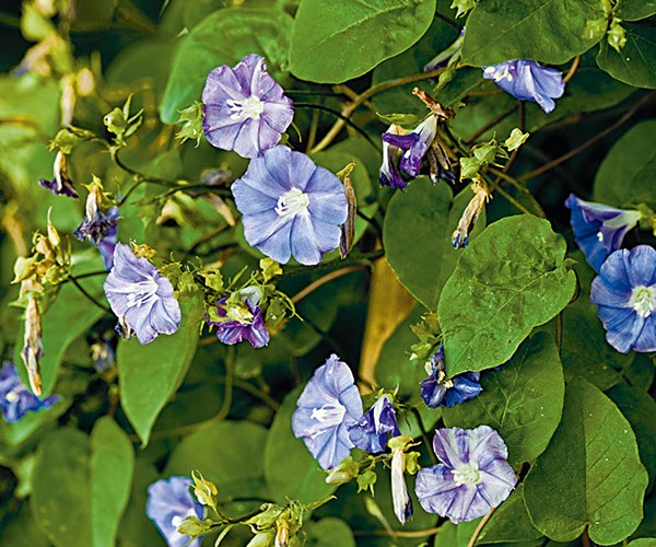 ดอก: ออกเป็นช่อกระจะตามซอกใบ มี 2 – 3 ดอก ดอกรูปกรวยตื้น กลีบเลี้ยงสีเขียว 5 กลีบ กลีบดอกสีฟ้าอมม่วง โคนดอกเชื่อมติดกันเป็นหลอด ปลายแผ่บาน ออกดอกตลอดปี