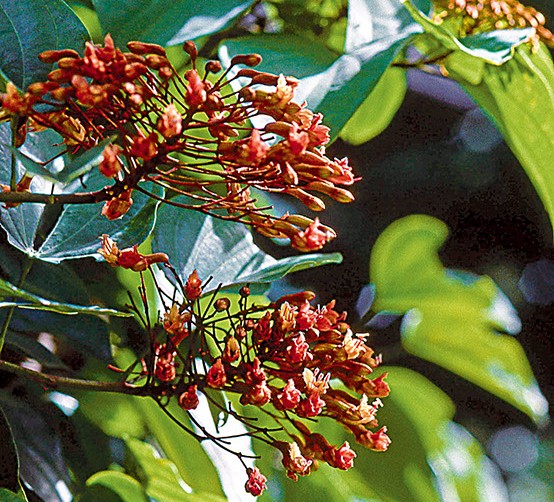 ดอก: ออกเป็นช่อกระจุก โคนกลีบเลี้ยงเชื่อมติดกัน ปลายแยกเป็น 3 แฉก กลีบดอก 5 กลีบ สีส้มอมชมพูหรือส้ม บางครั้งพบมีสีขาว ออกดอกเดือนสิงหาคมถึงกันยายน