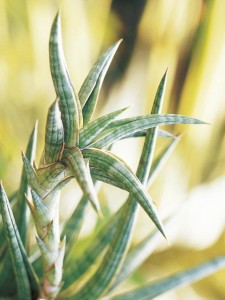 ใบ: ใบค่อนข้างกลม ปลายเรียวแหลมออกเวียนเป็นรัศมี กว้าง 2 – 2.5 เซนติเมตร ยาว 10 – 15 เซนติเมตร แผ่นใบแข็งสีเขียวอมเทา มีเส้นสีเขียวเข้มพาดตามยาว ขอบใบสีส้ม งุ้มงอขึ้นเป็นร่อง