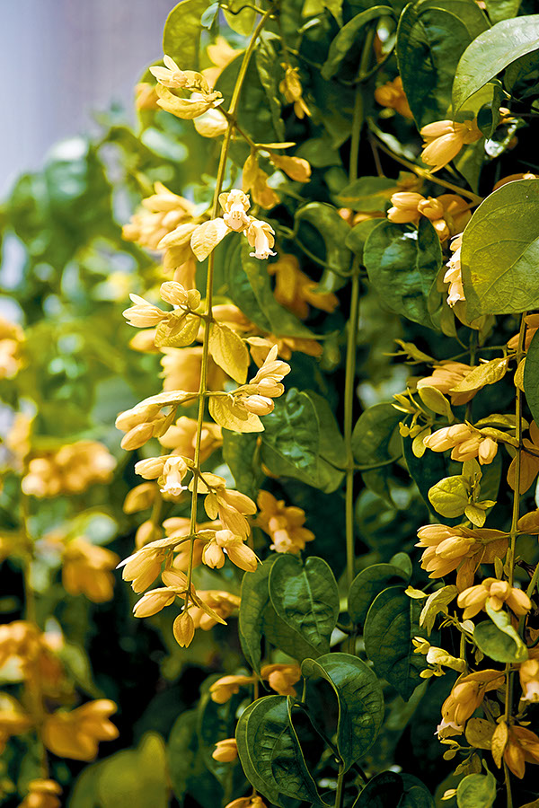 ดอก: ออกเป็นช่อตามปลายยอด ช่อยาว 15-45 เซนติเมตร กลีบประดับสีเหลือง แตกช่อย่อย ดอกย่อยเป็นหลอด กลีบเลี้ยง 5 กลีบรูปขอบขนาน ปลายแหลม กลีบดอกสีเหลือง โคนกลีบสีเหลืองเชื่อมติดกันเป็นหลอด ปลายแยกออกเป็น 5 กลีบซ้อนทับกัน ด้านบน 3 กลีบ ด้านล่าง 2 กลีบ มีขนปกคลุม เมื่อนำมาปลูกเลี้ยงจะออกดอกได้ตลอดปี แต่ในธรรมชาติออกเดือนสิงหาคม-กันยายน