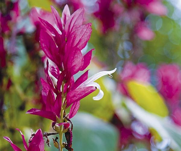 ดอก: ออกเป็นช่อกระจุกแยกแขนงตามซอกใบใกล้ปลายกิ่ง ช่อดอกรูปพีระมิด ยาว 5 – 9 เซนติเมตร ดอกย่อยจำนวนมาก โคนกลีบดอกเชื่อมติดกันเป็นหลอด ยาว 2 – 4 เซนติเมตร กลีบบาง ปลายแยกเป็น 5 กลีบ สีม่วงเข้ม ออกดอกเดือนธันวาคม – มีนาคม