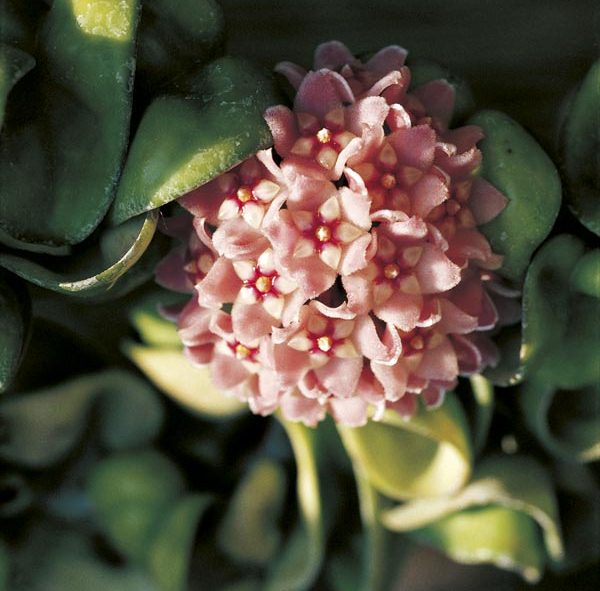 ดอก: ช่อดอกห้อยลง มีช่อละ 20 – 30 ดอก ดอกรูปดาว สีชมพูอ่อน มงกุฎสีแดงสด คล้ายโฮย่าคาร์โนซา เมื่อบานเต็มที่มีเส้นผ่านศูนย์กลาง 1 – 1.5 เซนติเมตร มีขนนุ่มปกคลุม กลิ่นอ่อน ๆ ออกดอกตลอดปี