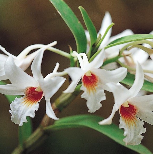 ดอก: ออกตามข้อใกล้ยอด เป็นดอกเดี่ยวหรือเป็นช่อสั้นๆ มี 1-3 ดอก กลีบดอกสีขาว ปลายกลีบปากแผ่เป็นแผ่นยาว ขอบหยักเป็นคลื่น สีขาว มีเส้นสีแดงอมส้มตามความยาวกลีบ จากโคนมาถึงช่วงกลางกลีบ ขนาดดอก 8-9 เซนติเมตร ออกดอกเดือนมีนาคม-เมษายน