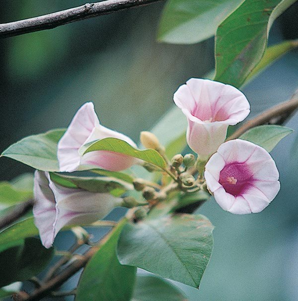ดอก: ออกเป็นช่อตามซอกใบ 1-5 ดอก สีม่วงอ่อนหรือสีชมพู โคนกลีบสีขาว ปลายแผ่ติดกัน ด้านนอกของโคนดอกมีขนเป็นแฉก ขนาดดอก 3.5-4 เซนติเมตร ออกดอกเดือนตุลาคม-ธันวาคม