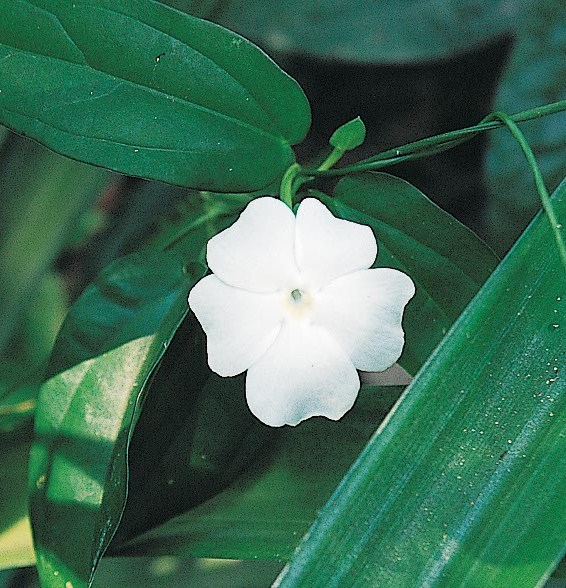 ดอก: สีขาว ออกเดี่ยวหรือออกเป็นคู่ตามซอกใบ โคนกลีบเชื่อมเป็นหลอดตื้นปลายแยก 5 กลีบ ขนาดดอก 3 เซนติเมตร ขนาดดอก 2-3 เซนติเมตร ออกดอกเดือนกันยายน-มากราคม