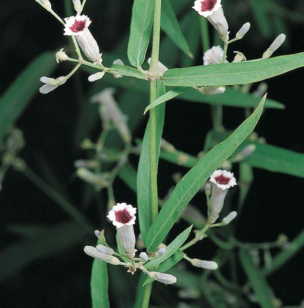 ดอก: ออกเป็นช่อตามซอกใบและหลายกิ่ง ดอกย่อยจำนวนมาก ดอกสีขาว รูปหลอด ด้านในสีม่วงเข้ม ปลายแยก 5 แฉกตื้นๆ และหยิกย่น ออกดอกเดือนมีนาคม-พฤษภาคม