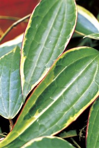 ใบ: ใบรูปไข่ กว้าง 5 – 7 เซนติเมตร ยาว 8 – 12 เซนติเมตร ปลายใบเรียวแหลม โคนใบมน สีเขียวเป็นมัน ขอบใบมีแถบด่างสีขาวขลิบแดง เห็นเส้นใบชัดเจน