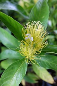 ดอก: ดอกออกเป็นช่อที่ปลายยอด ประกอบด้วยใบประดับลักษณะเป็นเส้นสีเหลืองคล้ายพู่ มีดอกเล็กๆ สีขาวแทรกอยู่ระหว่างซอกใบประดับ ออกดอกช่วงฤดูหนาว