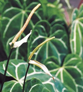 ดอก: ออกที่ซอกกาบใบ จานรองดอกรูปใบหอก กว้างประมาณ 1.5 เซนติเมตร ยาว 5 – 7 เซนติเมตร สีขาว ปลีดอกยาว 5 – 8 เซนติเมตร สีเหลืองอ่อน ก้านช่อดอกกลมเล็ก ยาวประมาณ 35 เซนติเมตร