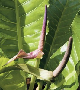 ดอก: ออกที่ซอกกาบใบ จานรองดอกรูปไข่แกมรูปใบหอก ยาว 6 – 8 เซนติเมตร ปลายเรียวแหลมและบิดสีม่วงแดง ปลีดอกยาวประมาณ 6 เซนติเมตร อวบและเรียว สีม่วงแดง ก้านช่อดอกกลม สีเขียว โคนก้านสีม่วงแดงเรื่อ