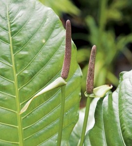 ดอก: ออกที่ซอกกาบใบ จานรองดอกรูปใบหอก ยาว 5 – 8 เซนติเมตร ปลายเรียวแหลม สีเขียวปลายสีแดงเรื่อ ปลีดอกสีม่วงเรื่อ ยาวประมาณ 6 เซนติเมตร ก้านช่อดอกกลม ยาวประมาณ 40 เซนติเมตร สีเขียว