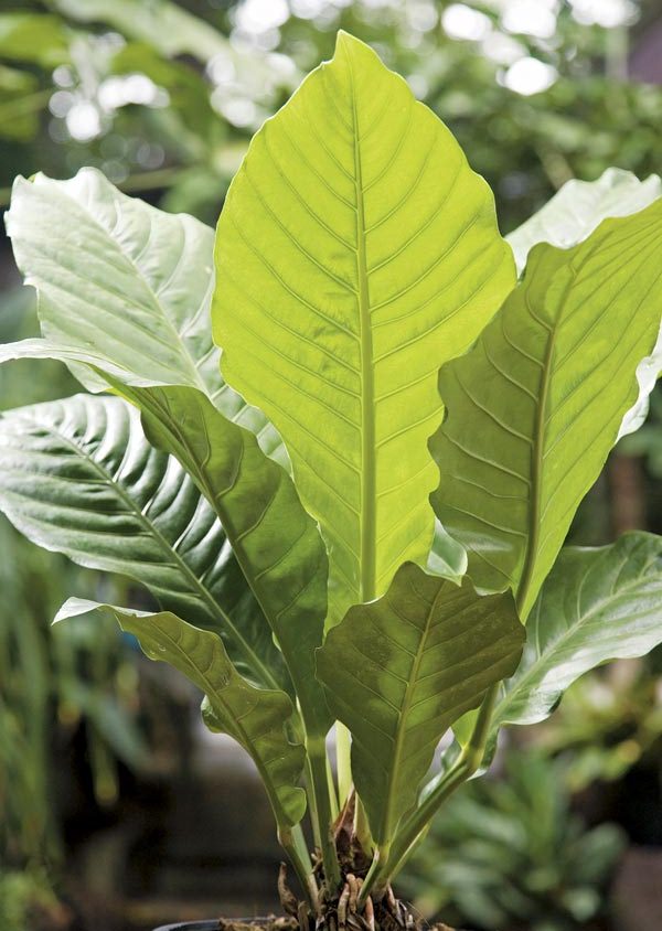 ใบ: ใบรูปไข่กลับ กว้าง 15 – 20 เซนติเมตร ยาว 40 – 50 เซนติเมตร ปลายใบค่อนข้างแหลม โคนใบสอบ ขอบใบย่นเป็นคลื่น เห็นเส้นใบชัดเจน แผ่นใบเรียบกว่า A. crassinervium ก้านใบเป็นเหลี่ยมและมีร่อง