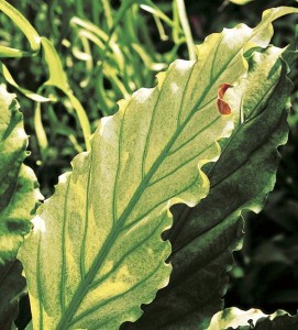 ใบ: ใบรูปไข่กลับ กว้าง 12 – 20 เซนติเมตร ยาว 50 – 60 เซนติเมตร ปลายใบเรียวแหลม โคนใบสอบ ขอบใบย่นเป็นคลื่นคล้ายหน้าวัวใบเลิฟลีเคิร์ฟ แต่แผ่นใบแคบและย่นน้อยกว่า สีเขียว มีลายด่างสีเหลืองอ่อน ก้านใบค่อนข้างกลม ยาวประมาณ8 เซนติเมตร