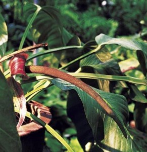 ดอก: ออกที่ซอกกาบใบ จานรองดอกรูปไข่ กว้าง 5 – 7 เซนติเมตร ยาว 15 – 30 เซนติเมตร ปลายเรียวแหลมและบิดเป็นเกลียว สีเขียวมีริ้วสีม่วงแดงเรื่อ ปลีดอกมีเส้นผ่านศูนย์กลาง 1.5 – 2 เซนติเมตร ยาว 15 – 20 เซนติเมตร สีเหลืองอมแดงเรื่อ ก้านช่อดอกยาว 20 – 25 เซนติเมตร