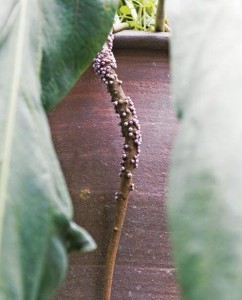 ดอก: ออกที่ซอกกาบใบ จานรองดอกรูปใบหอกกว้าง 1.5 – 4.8 เซนติเมตร ยาว 20 – 30 เซนติเมตร ปลายเรียวแหลม สีเขียวอ่อน หนาคล้ายแผ่นหนัง ห้อยและบิดเป็นเกลียว ปลีดอกยาว 19 – 38 เซนติเมตร เส้นผ่านศูนย์กลางประมาณ 9 มิลลิเมตร สีม่วงแดง บิดเป็นเกลียวและห้อยลงเช่นกัน ก้านช่อดอกกลม ยาว 35 – 52 เซนติเมตร เส้นผ่านศูนย์กลางใกล้เคียงกับก้านใบ