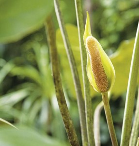 ดอก: ออกที่ซอกกาบใบ จานรองดอกรูปไข่ กว้าง 3 – 4 เซนติเมตร ยาว 5 – 8 เซนติเมตร ปลายเรียวแหลม สีเขียวอ่อน ห่อหุ้มปลีดอกไว้ ปลีดอกยาว 4 – 5 เซนติเมตร สีเหลืองอมม่วงแดง ก้านช่อดอกยาว 40 – 50 เซนติเมตร