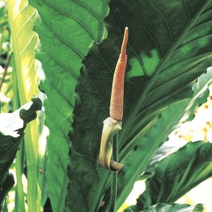 ดอก: ออกที่ซอกกาบใบ จานรองดอกรูปใบหอก กว้าง 4 – 7 เซนติเมตร ยาว 10 – 20 เซนติเมตร ปลายเรียวแหลมและบิดม้วน ปลีดอกยาว 8 – 20 เซนติเมตร สีขาวครีม ก้านช่อดอกกลม ยาว 30 – 35 เซนติเมตร สีเขียวเข้ม