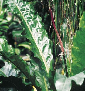 ดอก: ออกที่ซอกกาบใบ จานรองดอกรูปใบหอก กว้าง 4 – 7 เซนติเมตร ยาว 10 – 20 เซนติเมตร ปลายเรียวแหลม บิดและลู่ลง สีม่วงแดง ปลีดอกยาว 12 – 20 เซนติเมตร สีม่วงแดง ก้านช่อดอกกลม ยาว 25 – 30 เซนติเมตร สีเขียว