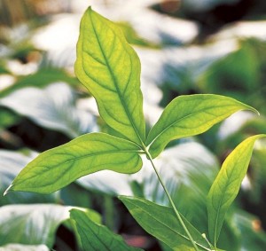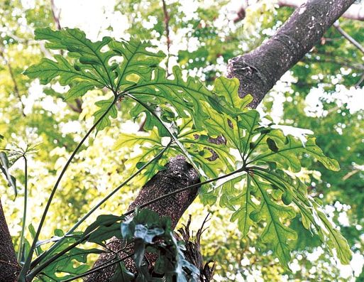 ใบ: ใบประกอบแบบนิ้วมือ เมื่อยังเล็กใบหยักเป็น 3 แฉก พอโตเต็มที่แผ่นใบใหญ่ถึง 1 เมตร ขอบใบหยักเพิ่มขึ้นเป็น 8 – 9 แฉก ขอบใบหยักเว้าลึก แผ่นใบค่อนข้างหนา ก้านใบกลม ยาว 0.45 – 1.50 เมตร มีร่องเล็ก ๆ ตลอดความยาวใบ