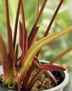 ดอก: ช่อดอกออกที่ซอกใบเป็นช่อเชิงลดมีกาบ ก้านช่อดอกสีขาว มักโค้งลง ใบประดับคล้ายกาบรองรับช่อดอกสีแดง ปลีดอกสีขาวนวล