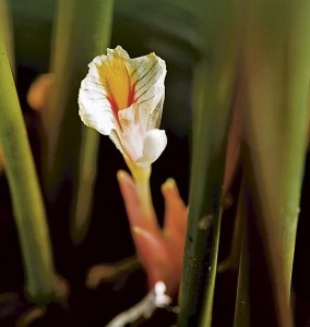 ดอก: ช่อดอกออกจากเหง้าใบประดับเล็ก ๆ ปลายแหลม สีแดงอ่อน ดอกสีขาว กลีบปากสีขาวมีแถบกลาง