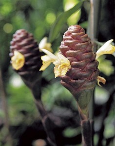 ดอก: ช่อดอกออกจากเหง้า มีใบประดับเรียงซ้อนกันเป็นชั้น สีแดงคล้ำ ดอกสีเหลืองอ่อนมีประสีม่วงแดงอ่อน ๆ