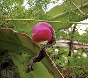ผล: ค่อนข้างกลม บิดเบี้ยวเล็กน้อย ขนาดประมาณ 4 เซนติเมตร สีชมพูสด ภายในมีเนื้อนุ่มสีขาว มีเมล็ดสีดำกลมเล็ก ๆ จำนวนมาก