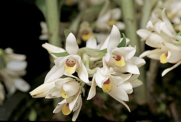 ดอก: ช่อดอกออกจากเหง้า เกิดก่อนหรือพร้อมกับผลิใบ ช่อยาวประมาณ 10 เซนติเมตร ดอกสีขาวกลีบปากสีเหลือง โคนสีน้ำตาลแดง