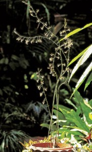 ดอก: ช่อดอกออกจากหัว ก่อนผลิใบ มี 6 – 18 ดอกต่อช่อ กลีบดอกสีน้ำตาลอ่อน กลีบปากสีชมพูอ่อน