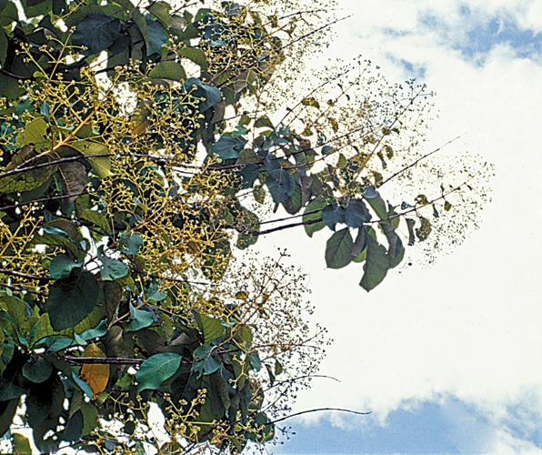 ดอก: ออกเป็นช่อแยกแขนงที่ซอกใบใกล้ปลายกิ่ง ช่อขนาดใหญ่ ดอกย่อยจำนวนมากสีขาวนวล