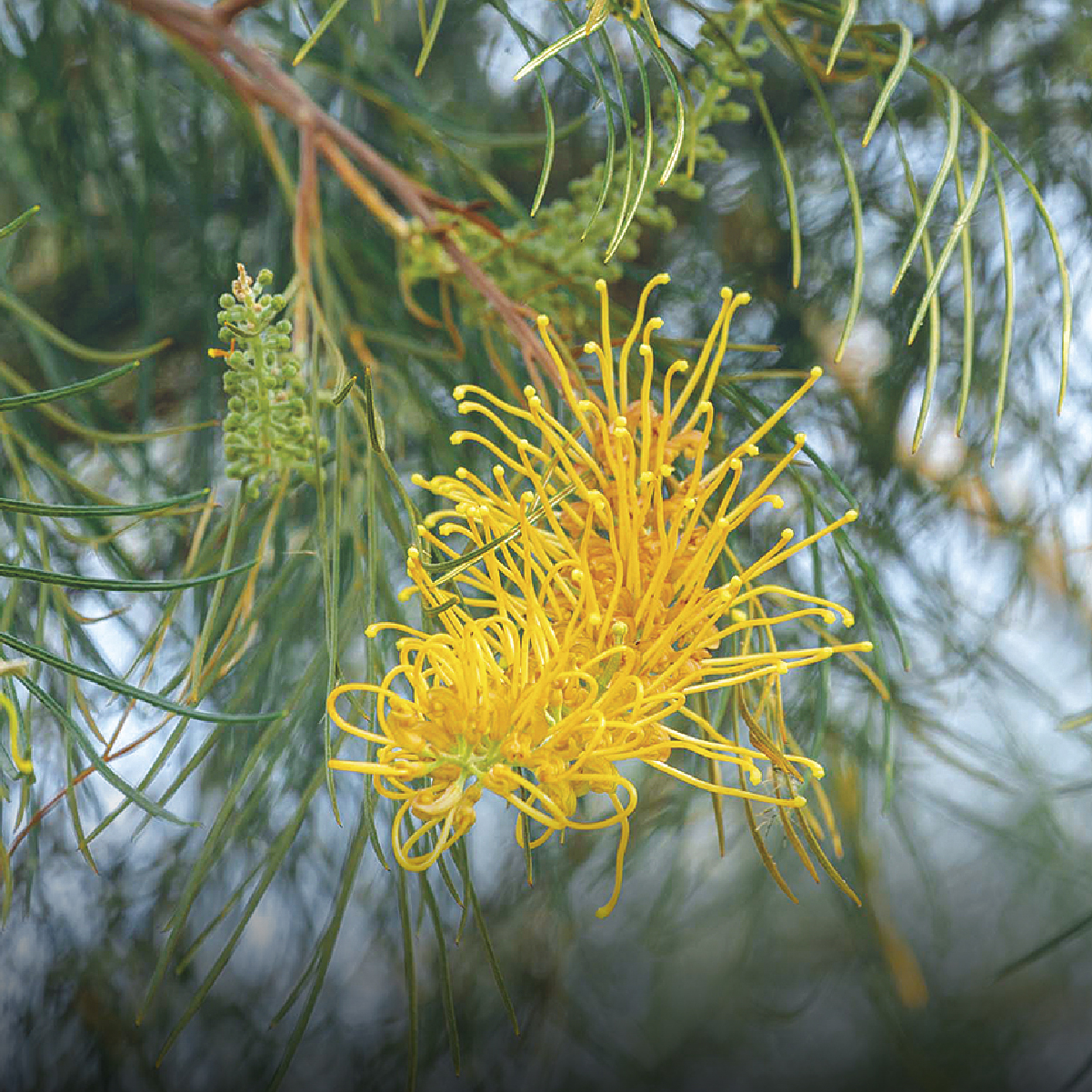 ต้นสนเกรวิลเลีย ถิ่นกำเนิดจากหมู่เกาะในมหาสมุทรแปซิฟิก มีจุดเด่นเรื่องความหลากหลายของสายพันธุ์ ซึ่งมีฟอร์มและสีใบแตกต่างกันไป ตั้งแต่สีเขียว สีเขียวอมเทา สีเงินจนถึงเกือบขาว สามารถออกดอกได้ตลอดปี มีหลายสีให้เลือกปลูก ทั้งสีขาว สีขาวอมเหลือง สีเหลือง สีส้ม สีแดง สีชมพู และสีม่วง