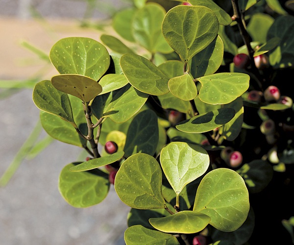 ใบ: ใบเดี่ยวเรียงเวียนสลับ รูปไข่กลับหรือรูปช้อน กว้าง 6-7 เซนติเมตร ยาว 7-9 เซนติเมตร ปลายใบมน โคนใบสอบ แผ่นใบแข็งหนาคล้ายแผ่นหนังด้านบนใบเห็นเส้นใบนูนขึ้น ก้านใบมีสีแดงเรื่อ