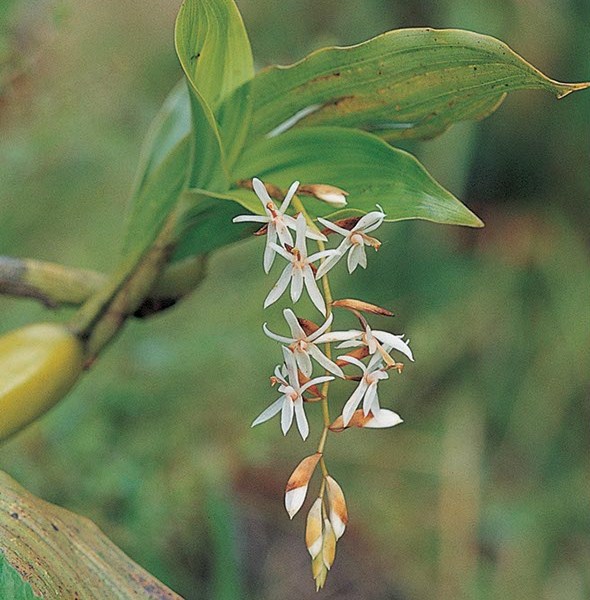 ดอก: ออกเป็นช่อกระจะที่ซอกใบใกล้ปลายยอด ดอกเล็กสีขาว แต่มักไม่พบ