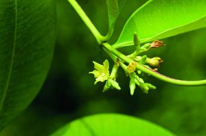 ใบ: เดี่ยว รูปไข่ ขนาด 2-4 x 3-5 เซนติเมตร ปลายเป็นติ่งแหลม โคนรูปลิ่ม ขอบเรียบ แผ่นใบสีเขียวอ่อนเป็นมัน เส้นกลางใบเห็นชัดเจน หลังใบสีขาว