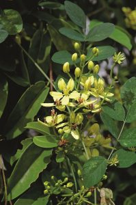 ดอก: ออกเป็นช่อกระจะที่ปลายยอด 5-12 ดอก ดอกทรงกลม กลีบเลี้ยงสีเขียวอ่อน 5 กลีบ กลีบดอกสีเหลืองสด 5 กลีบ โคนสอบ ขอบกลีบเรียบ เส้นผ่านศูนย์กลางดอก 2-3 เซนติเมตร ออกดอกตลอดปี
