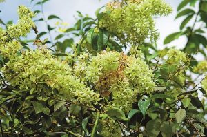 ดอก: ออกเป็นช่อแยกแขนงที่ปลายยอดหรือซอกใบ มีขนปกคลุมทั่วไป ดอกย่อยจำนวนมาก กลีบรองกลีบดอก 5 กลีบ สีเขียวอมเหลือง โคนกลีบเชื่อมติดกัน ปลายแยกเป็น 5 แฉก มีขนปกคลุม ไม่มีกลีบดอก ออกดอกเดือนธันวาคมถึงกุมภาพันธ์