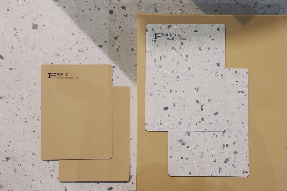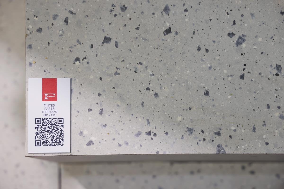 เพื่อผสมผสานคุณสมบัติอันเป็นเอกลักษณ์ของหินขัดเข้าไปกับการตกแต่งพื้นผิวทั้งแนวนอนและแนวตั้ง Formica ได้สร้างสรรค์ลามิเนตแรงอัดสูงคุณภาพ โดยลวดลายเทอร์ราซโซเกิดจากเศษกระดาษเหลือทิ้ง กระบวนการผลิตวัสดุต้นแบบนี้ เริ่มต้นจากการสร้างเนื้อเยื่อกระดาษ โดยการใช้น้ำ การย้อม และกระดาษรีไซเคิลที่ถูกฉีกออกเป็นชิ้น ๆ โดยส่วนผสมทั้งหมดจะถูกทำให้แห้ง เพื่อแปรสภาพเป็นกระดาษสำหรับตกแต่งที่มีหน้าตาและผิวสัมผัสของวัสดุเหลือใช้ที่นำมารีไซเคิล