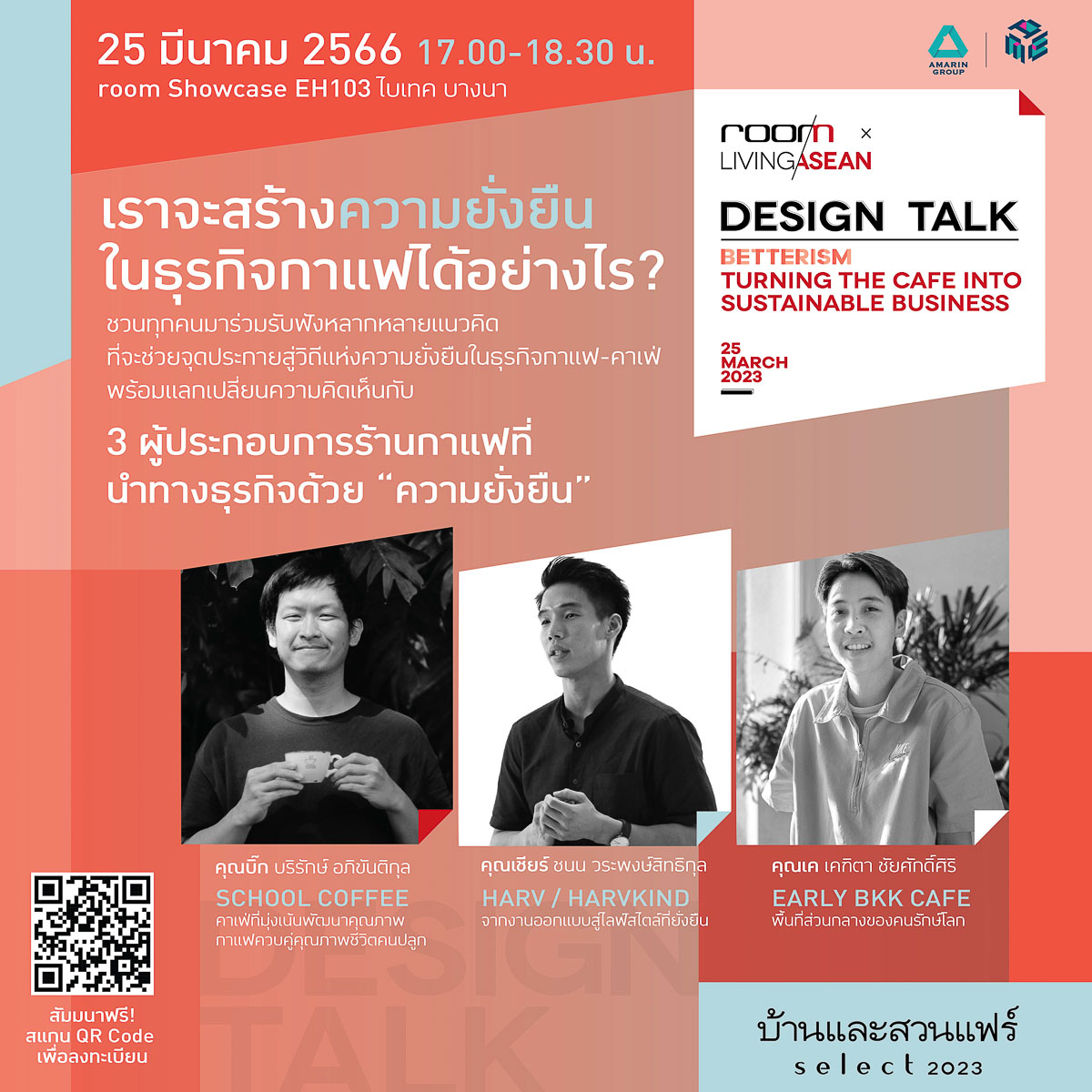 17.00-17.15 น. ลงทะเบียน17.15-18.15 น. ช่วงเสวนา18.15-18.30 น. ตอบข้อซักถามจากทางบ้าน และผู้เข้าร่วมกิจกรรม.วันที่ 25 มีนาคม 2023เวลา 17.00 – 18.30 น.ณ room Showcase (EH103)งานบ้านและสวนแฟร์ Select ไบเทค บางนา.Betterism: Good Design for a Better Worldเพื่อส่งต่อแรงบันดาลใจในการสร้างธุรกิจด้วยงานออกแบบที่ดี ที่สามารถขับเคลื่อน ชุมชน สังคม และสิ่งแวดล้อมให้ยั่งยืนไปพร้อมๆกัน