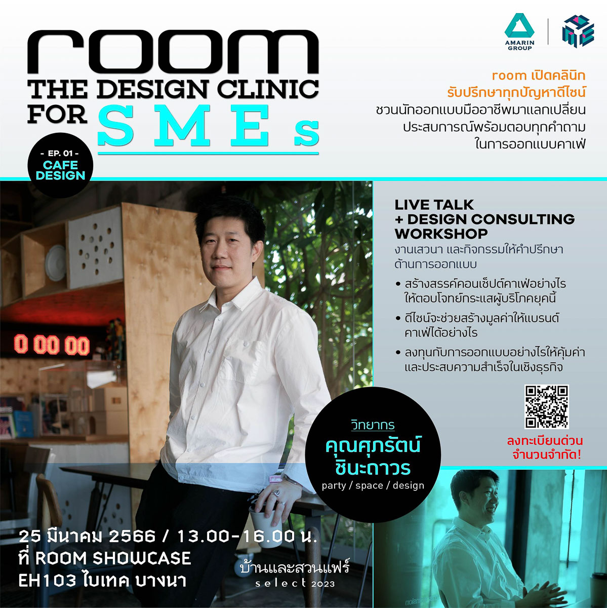 13.00-13.30 น. ลงทะเบียน13.30-14.30 น. ช่วงเสวนา14.30-14.45 น. พักเบรก14.45-16.00 น. กิจกรรมให้คำปรึกษาด้านการออกแบบ.วันที่ 25 มีนาคม 2023เวลา 13.00 – 16.00 น.ณ room Showcase (EH103)งานบ้านและสวนแฟร์ Select ไบเทค บางนา.The Design Clinic for SMEsroom เปิดคลินิกรับปรึกษาทุกปัญหาดีไซน์ในพื้นที่ธุรกิจ ไม่ว่าจะเป็นคาเฟ่ ร้านอาหาร บาร์ โฮสเทล หรือโรงแรม เราคือ “ตัวกลาง” เชื่อมต่อระหว่างนักออกแบบกับผู้ประกอบการ SMEs พร้อมสนับสนุนทุกพื้นที่ธุรกิจให้ขับเคลื่อนด้วยดีไซน์ที่ดี