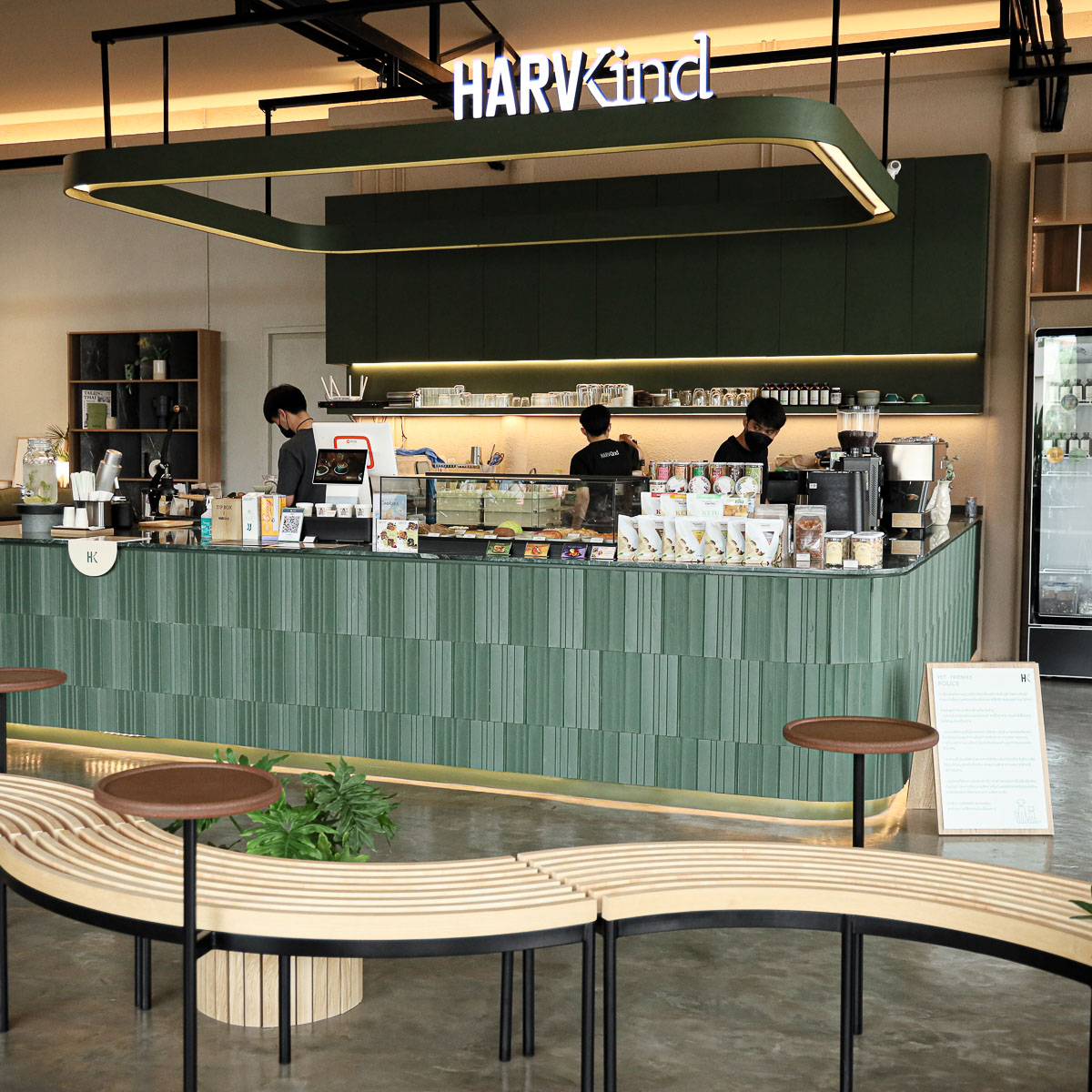 เชียร์-ชนน วระพงษ์สิทธิกุลผู้ร่วมก่อตั้ง Harvbrand และคาเฟ่ Harvkind“จากการเล็งเห็นความเป็นไปได้ในเศษเหลือทางอุตสาหกรรมเฟอร์นิเจอร์ และอุตสาหกรรมกาแฟ สู่การผสานสร้างเป็นวัสดุใหม่ และเกิดเป็นคาเฟ่ ที่เสมือนเป็นห้องทดลองกลางของผู้ที่สนใจงานออกแบบเพื่อความยั่งยืน”