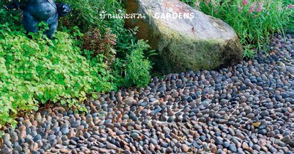 สวนนี้ เจ้าของเลือกปูพื้นด้วยกรวดสีเข้ม ซึ่งช่วยทำให้พื้นผิวเหมือนเป็นลำธารสวยงาม