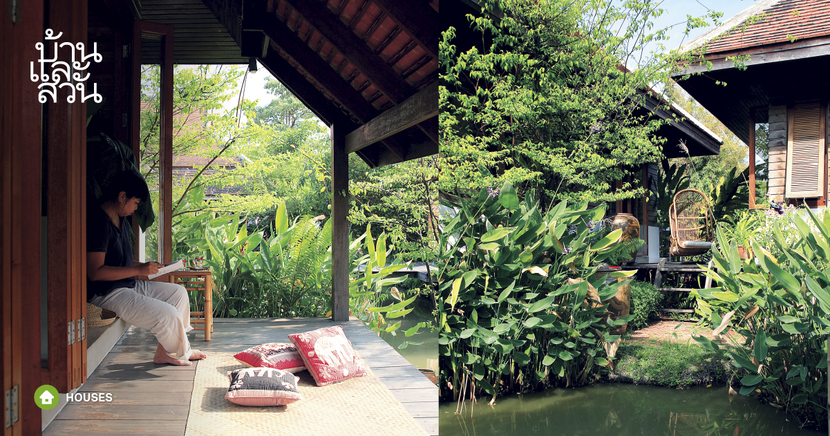 เรือนหมู่บ้านไม้ อยู่สบายแบบไทยๆ ที่แยกออกเป็น 3 หลัง แต่ละหลังเชื่อมต่อกันด้วยชานและสะพานไม้ที่พาดอยู่เหนือสระน้ำแบบขุด